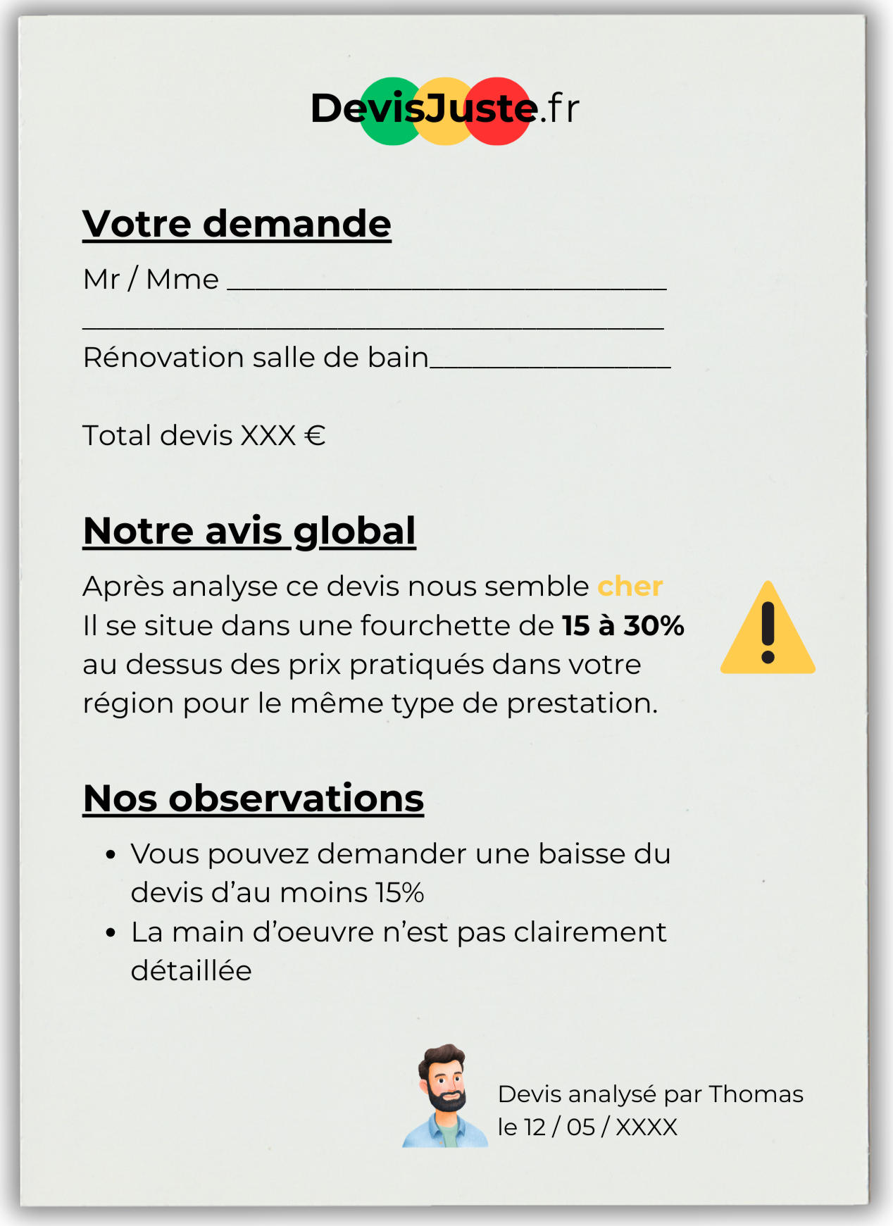 devisjuste.fr fournit une analyse indicative basée sur des fourchettes de prix généralement constatées sur le marché français par région au moment de l’étude.L’avis rendu constitue une opinion indépendante à titre informatif uniquement.Les décisions relatives à l’acceptation ou au refus d’un devis restent à la seule responsabilité du client.